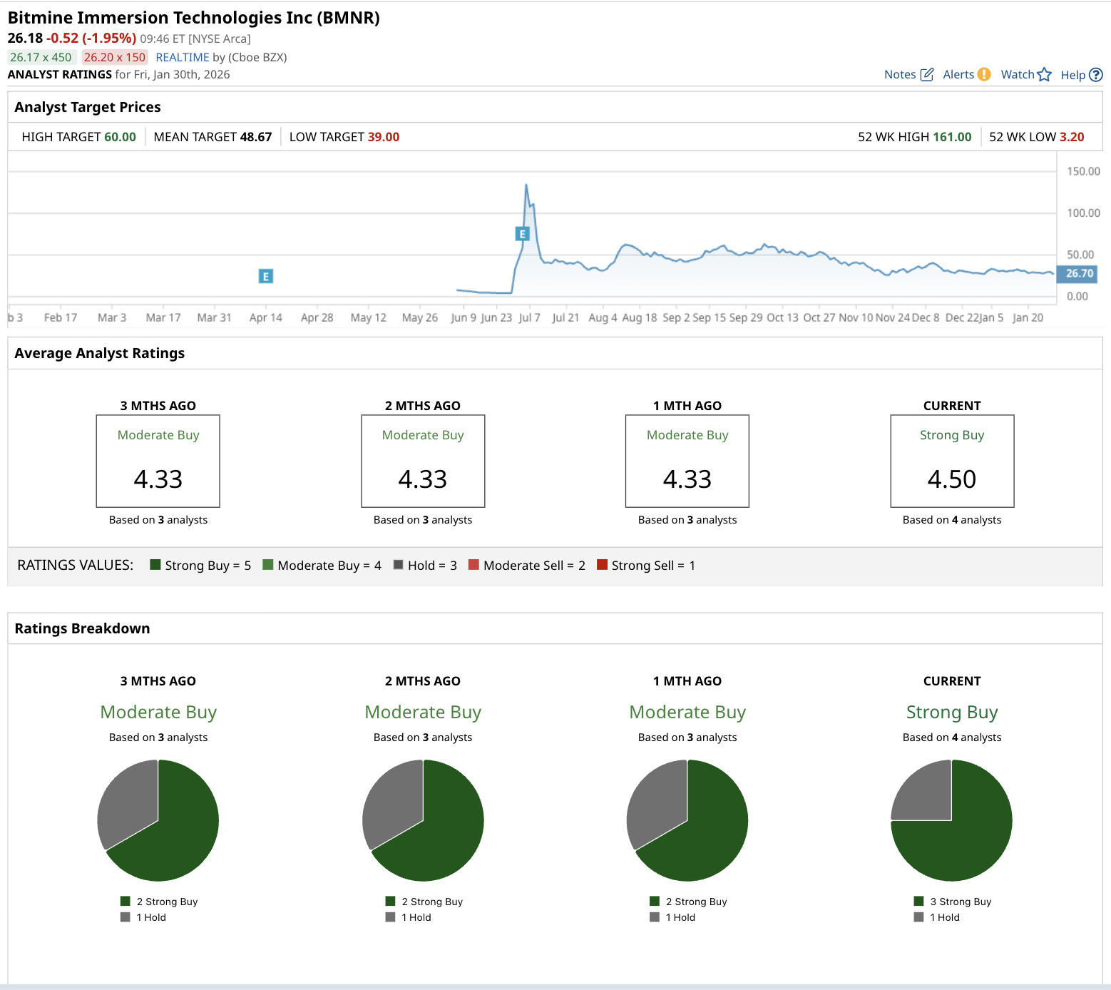目前覆盖BitMine Immersion的分析师数量为四名,整体共识评级为“强烈买入”。其中三名分析师给予“强烈买入”评级,一名维持“持有”观点。