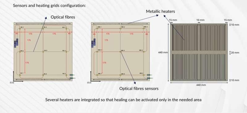 项目团队将光纤传感器网络集成到采用HealTech树脂浸渍的纤维中,形成复合结构原型。传感器用于对结构损伤进行精确定位;在检测到损伤后,结构通过集成的3D打印铝网格加热至100至140摄氏度,以触发自修复过程。
