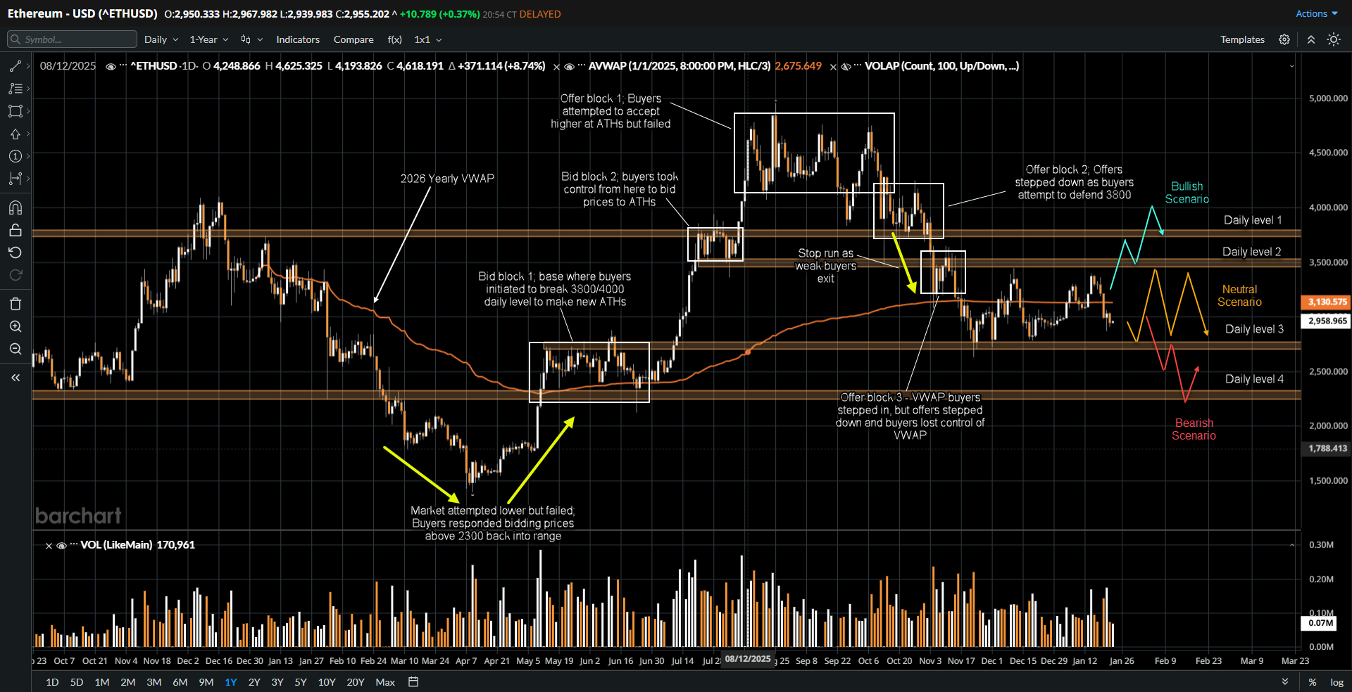 2025年11月,价格在年度成交量加权平均价(VWAP)附近出现买盘介入并短暂反弹,但卖方压力仍在,随后价格进一步回落至买盘区块1区域,买方再次入场支撑。自2025年11月以来,市场在约3500美元(日线级别2)与2700美元(日线级别3)之间形成相对均衡的双向交易区间,卖方在卖盘区块2上方防守,买方则在买盘区块1附近维持支撑。