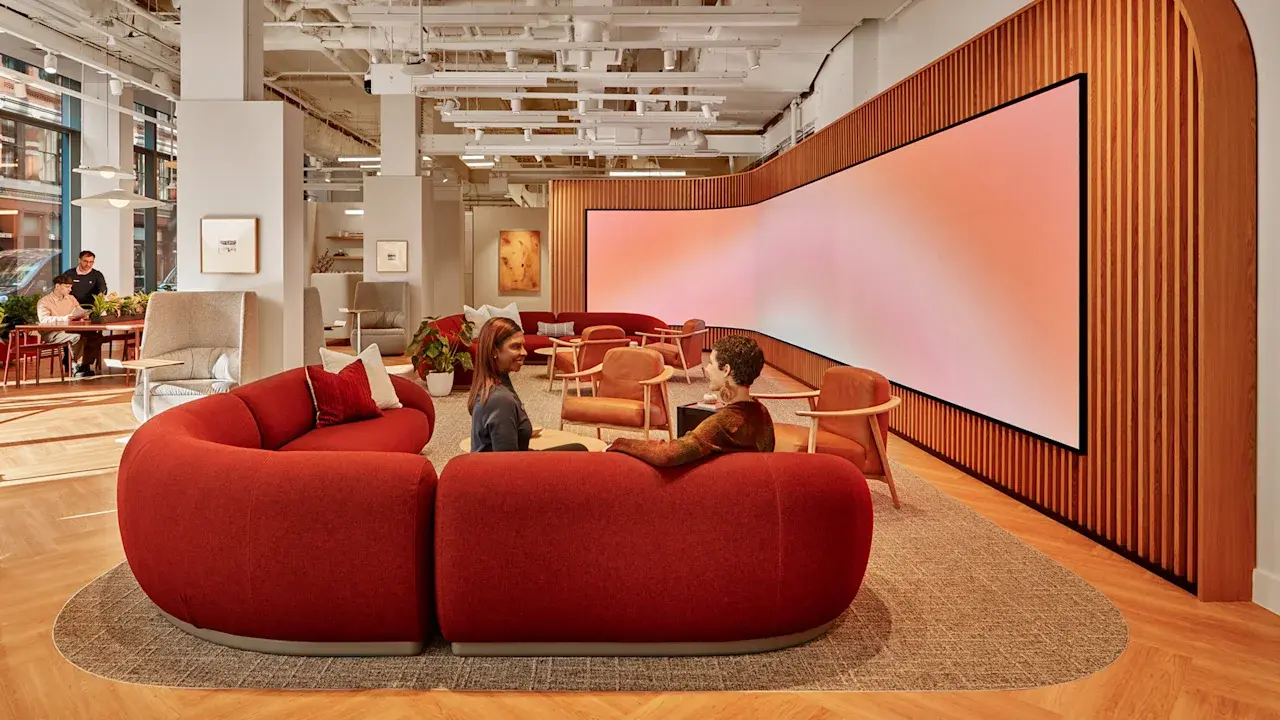 这家门店位于百老汇大道与大街交汇处,由建筑设计公司 Gensler 负责整体设计。店内采用日式与北欧风格相结合的布置,大量使用木质与自然元素,配有植物、软包沙发,以及一面约30英尺长的弧形橡木条墙,墙面循环播放色彩画面。入口区域设置了一个“感官穹顶”,配合受色彩疗法启发的灯光和舒缓音景,店铺后方则设有咖啡吧。整体氛围更接近健康酒店大堂,而非传统意义上的税务服务网点。