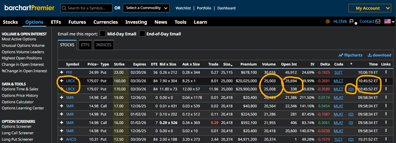 期权市场的最新动向进一步凸显了机构投资者的谨慎态度。12月26日(周五),Lam Research期权交易中出现一笔规模较大的防御性看跌期权展期操作: