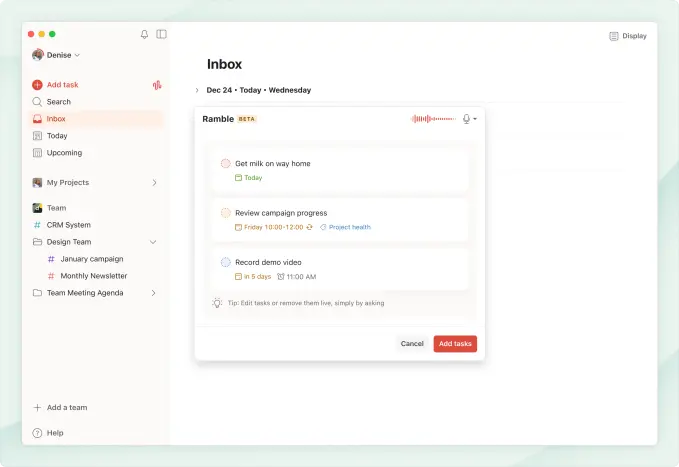 Doist 表示,Ramble 的设计初衷是帮助用户在移动场景下快速记录任务,无需手动输入文字。用户点击应用中的 Ramble 图标后即可开始讲话,应用会将不成段、不结构化的语音内容整理为有条理的任务。