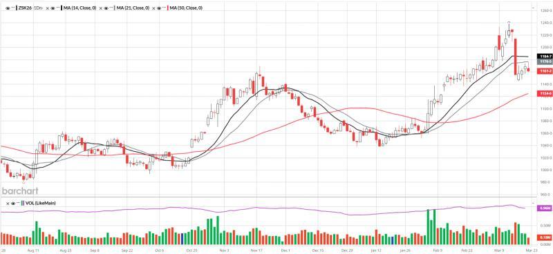 2026年5月大豆期货合约收于1160 ½美分,跌8美分。过去14个交易日内,该合约最高触及1238 ¾美分,最低为1145 ¼美分。