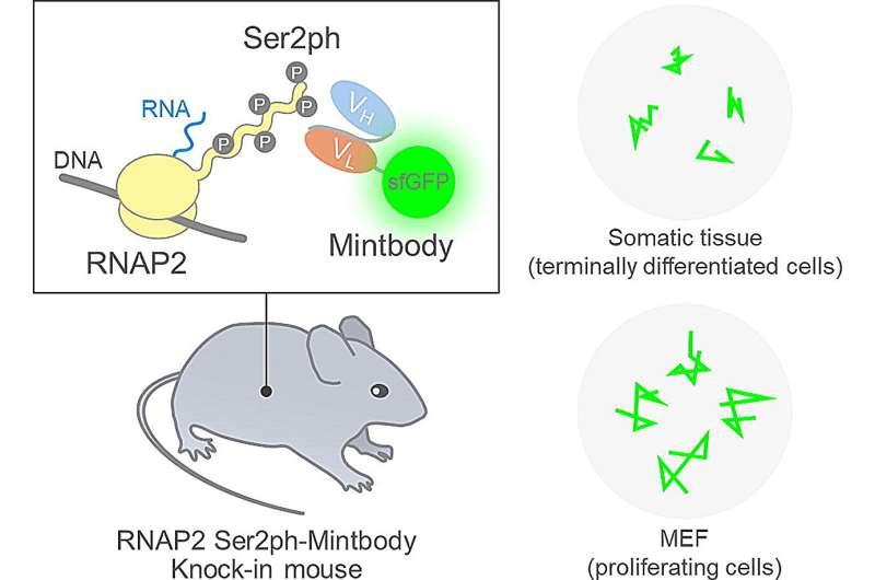 东京科学研究所(Science Tokyo)木村浩教授领导的研究团队为解决这一限制,采用持续追踪的思路,尝试在不停止细胞活动的情况下观察转录过程。团队将重点放在一种名为“mintbody”的荧光蛋白上。该蛋白由能够特异性结合活跃转录期间出现的磷酸化标记的抗体开发而来。