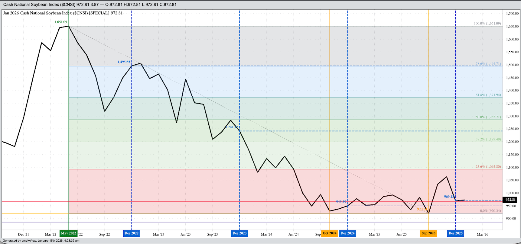 现货端数据显示,美国大豆基本面相对疲弱。国家大豆指数($CNSI)周三报 9.7275 美元,日涨 3.75 美分,但仍低于 1 月底创下的 5 年最低价 9.78 美元。报道指出,从供需角度看,这意味着当前美国大豆基本面较往年同期更为看跌。