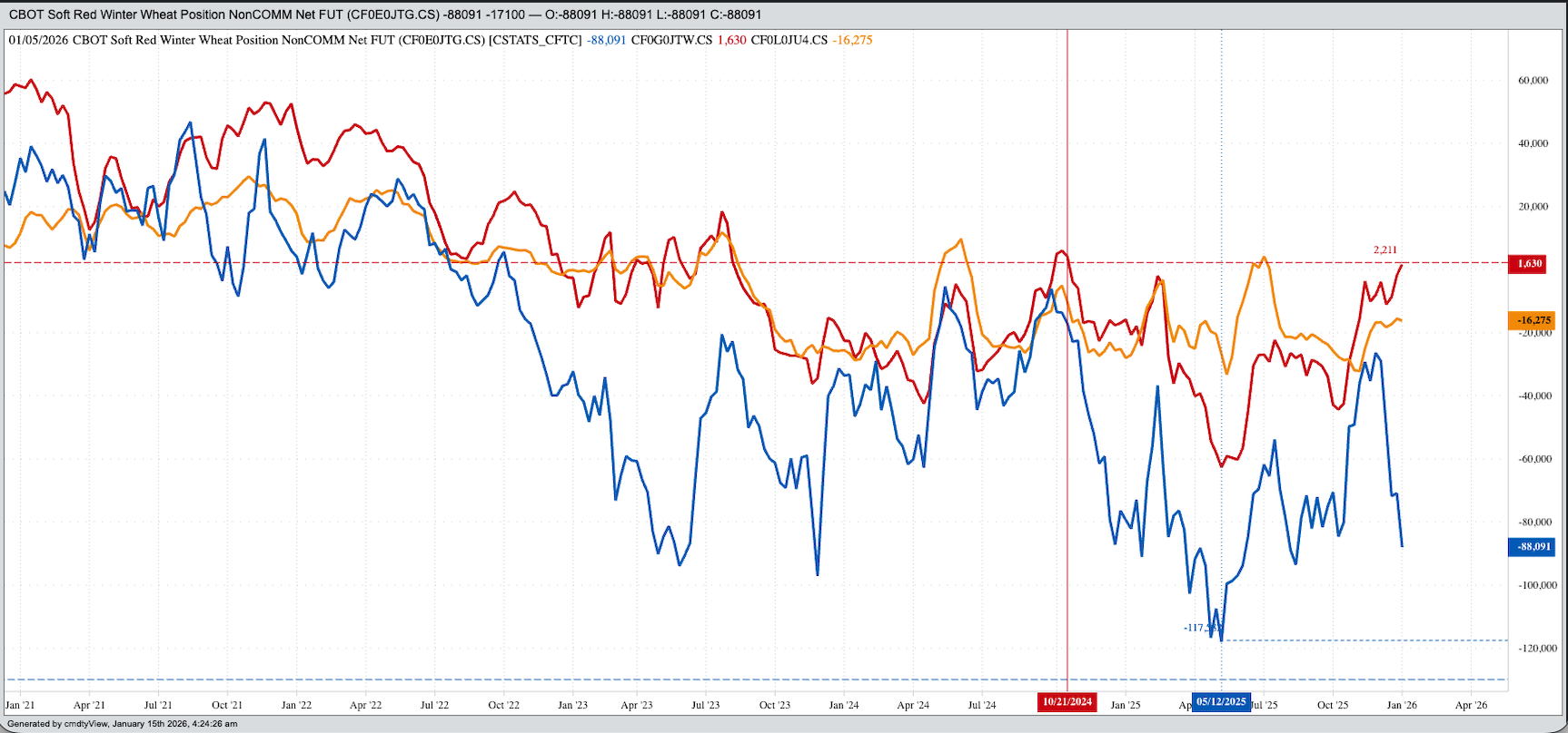 与此同时,最新更新显示,基金在软红冬小麦和硬红春小麦期货上的净空头仓位有所增加。