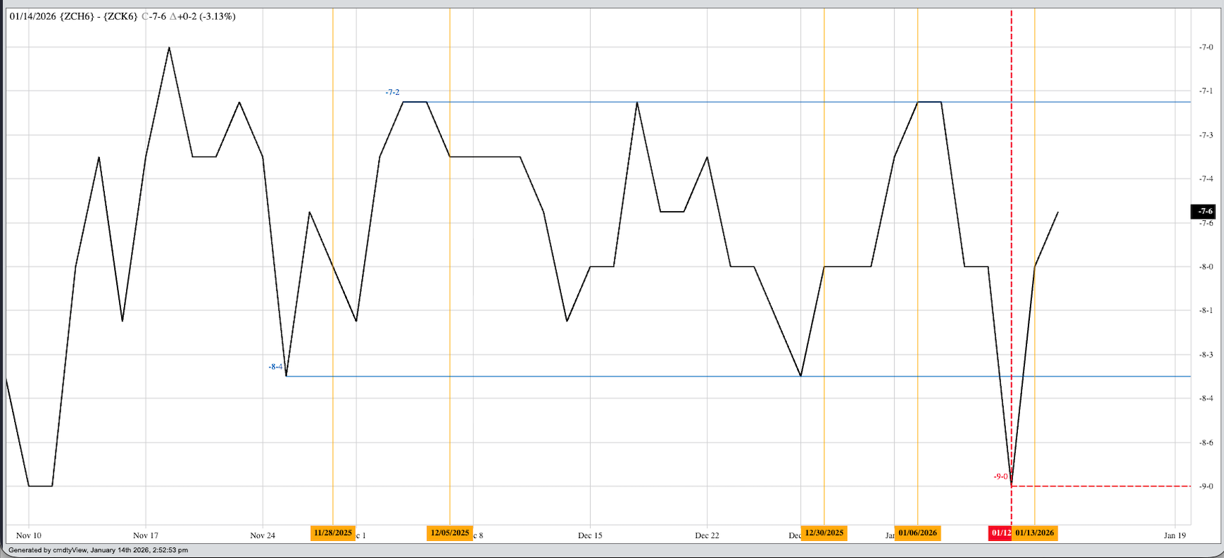 从价差结构看,报道称玉米基本面“更趋看涨”。周三结算价显示,3 月-5 月价差覆盖了约 37% 的全额商业持有成本,5 月-7 月价差覆盖约 30%。这被认为可能反映出本周现货端“粮仓紧闭”,导致国家玉米指数($CNCI)降至 3.83 美元,为去年 10 月 21 日以来最低水平。