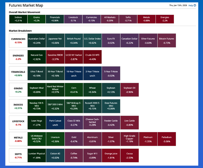 贵金属市场方面,黄金周三创下历史新高。现金黄金指数(GCY00)盘中最高触及 4,642.74 美元,较前一日上涨 56 美元,涨幅 1.2%。此后该指数自高位回落,周三收盘承压,隔夜走势继续偏弱。