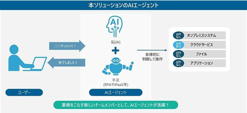 在该解决方案中,AI代理会理解当前的业务内容与处理进度,自主判断下一步应执行的操作。随后,由RPA(Robotic Process Automation,面向例行事务的自动化软件机器人)根据AI的判断结果,实际在各类系统上完成具体操作,从而将整个业务流程串联起来,实现端到端的一体化自动执行。其特点在于,不仅仅是单一任务的自动化,而是面向完整业务流程的整体自动化。