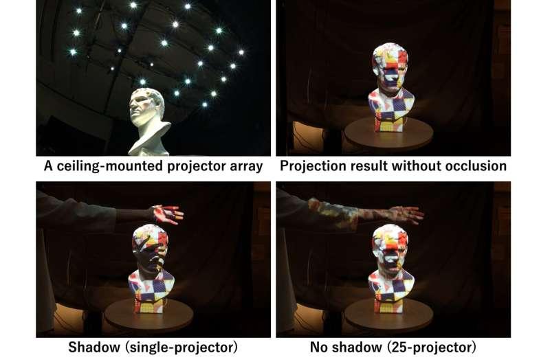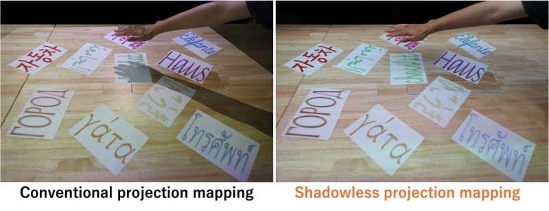研究团队通过设计“无影投影映射”系统,尝试让投影在用户操作桌面工作空间时不再被身体遮挡,从而削弱“这是投影”的感知线索,使投影效果更接近真实印刷品或物体表面的固有外观。