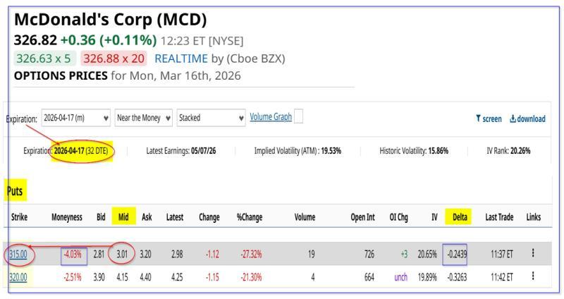 以4月17日到期的期权合约为例,执行价为315美元的麦当劳认沽期权(较当前股价折价约4%),其期权价格中点约为3.01美元: