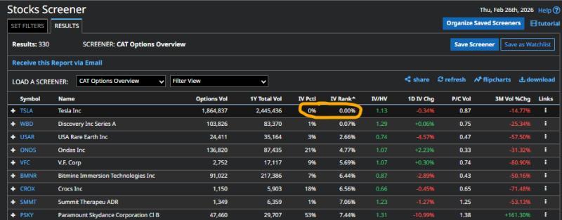 在某个周四的扫描结果中,特斯拉被识别为异常期权活动最突出的个股之一。其期权隐含波动率排名和隐含波动率百分位均为0%。