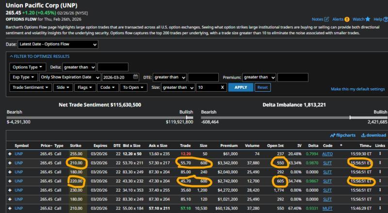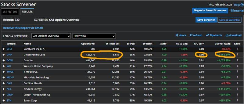 铁路股联合太平洋是同一周四扫描中另一只异常活跃的标的。其期权交易数据显示,看跌/看涨成交量比率一度降至0.00。