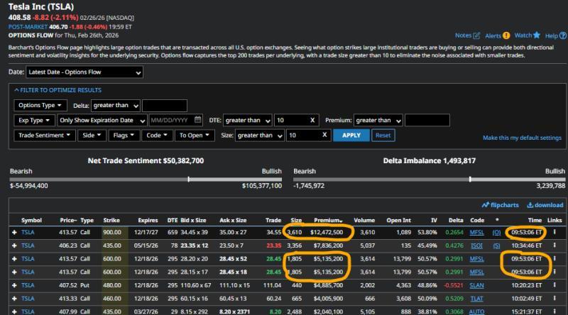 在此背景下,Barchart的特斯拉期权流页面显示,有一笔大额对角价差交易引人关注。周四早盘,一名大额交易者以每份6.10美元的价格成交了3,610份对角价差:
