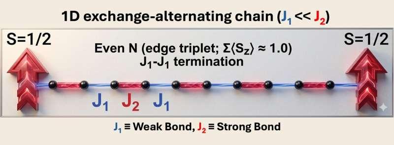 研究提出的第一类平台为“具有边缘磁矩的偶联S=1/2链”。在这一设定下,每个单体携带一个未配对电子,对应自旋1/2。链上相邻耦合呈强弱交替(偶联链),交替耦合会打开体态能隙,使激发需要一定能量;在特定终止方式下,链端会出现局域化的边缘磁矩。研究人员表示,这类边缘自旋并非外加,而是由强弱交替的耦合模式在边界处无法对称“闭合”所导致,并将其与Su–Schrieffer–Heeger(SSH)模型中的边界态类比。