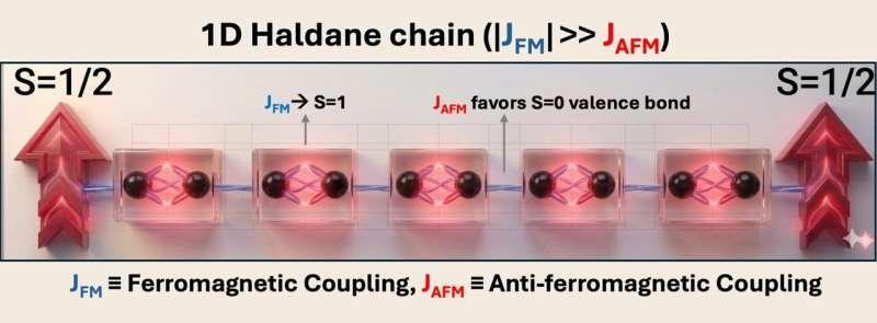 第二类平台为“Hund耦合的S=1 Haldane链”。在这一设定下,每个单体携带两个未配对电子,并倾向于在同一分子上自旋对齐(Hund规则),从而形成有效的自旋1位点。这些自旋1位点沿链以反铁磁方式耦合,构成Haldane链。研究人员指出,Haldane链的特征在于体态保持能隙,而开放端可承载分数化的自旋1/2边缘态,且相关边缘自由度由对称性保护。