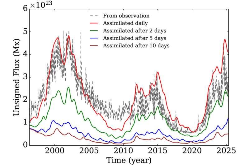 由于太阳内部无法被直接观测,过去研究多依赖基于简化假设的模型。为提高对内部过程的刻画能力,印度研究人员将长达30年的每日卫星磁场图(1996年至2025年)输入一个三维“太阳发电机”模型。该模型用于描述产生太阳磁场的物理过程。研究团队表示,通过同化真实观测数据,模型能够追踪磁场在太阳表面以下更深处的运动,而这些区域卫星观测无法直接穿透。