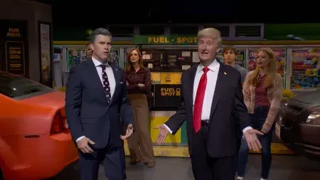 在节目中,扮演特朗普的詹姆斯·奥斯汀·约翰逊出现在一个加油站,一家人正为每加仑5美元的油价苦恼。