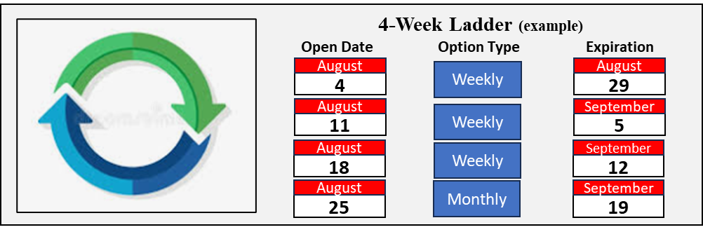 四周阶梯是一种时间多样化安排,将期权仓位分布在四个相互重叠的到期周期中。新仓位按固定节奏(通常为每周)逐步建立,临近到期的旧仓位则自然退出。