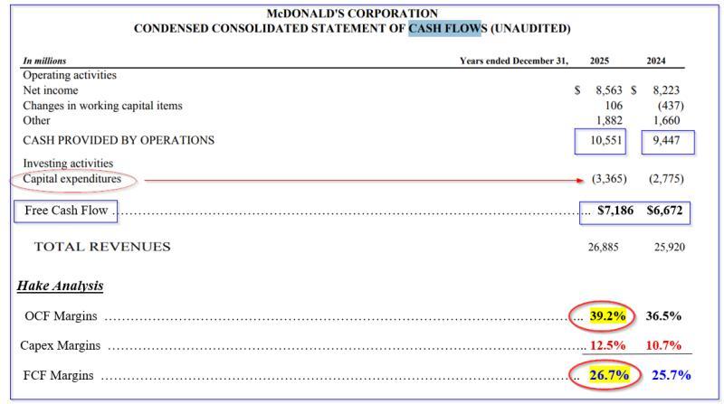 根据公司现金流量表及相关测算,尽管资本支出有所增加,麦当劳的OCF和FCF利润率在2025年的预期中仍呈上升趋势。