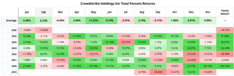 除波动率结构和预期波动区间外,一些市场参与者还参考季节性统计数据。Barchart 提供的季节性收益热力图显示,三月通常并非 CrowdStrike 股价的强势月份。不过,历史数据也显示,在表现较好的月份,该股的阶段性涨幅曾相对可观。