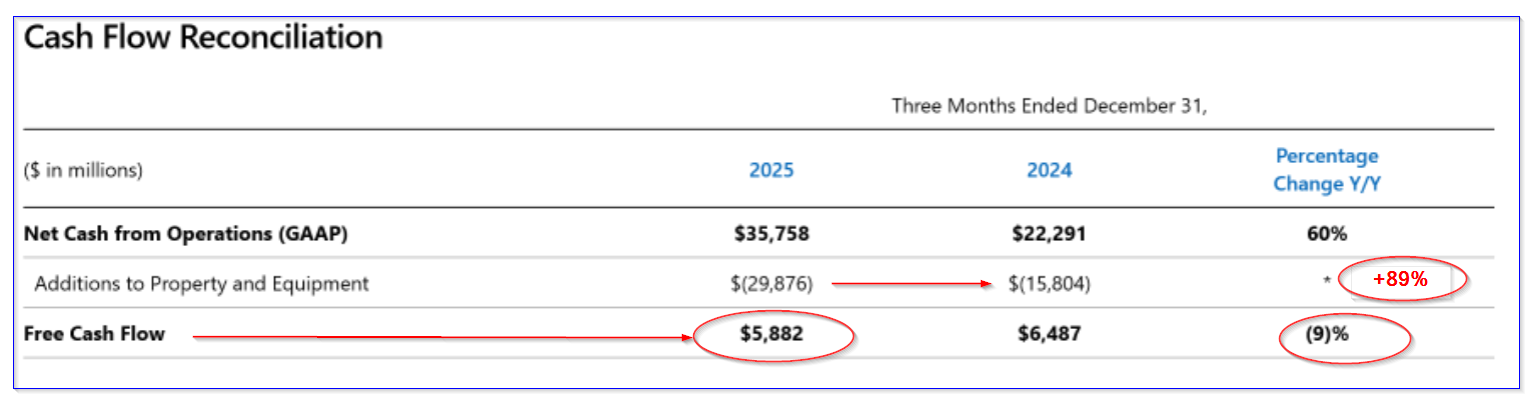 微软公司(Microsoft Corp,纳斯达克代码:MSFT)公布,截至2025年12月31日的2026财年第二季度,经营现金流同比增长60%,表现强劲。不过,在人工智能相关资本支出大幅增加的影响下,公司自由现金流出现明显回落。