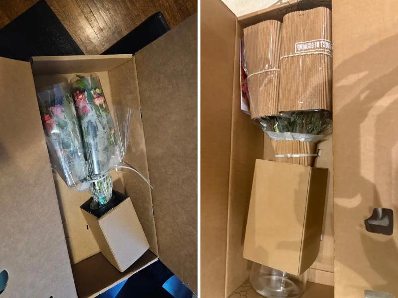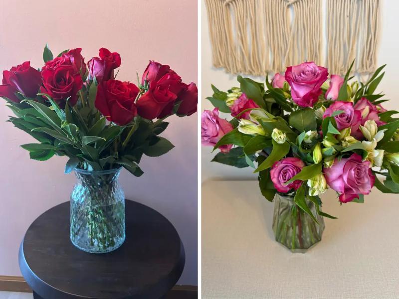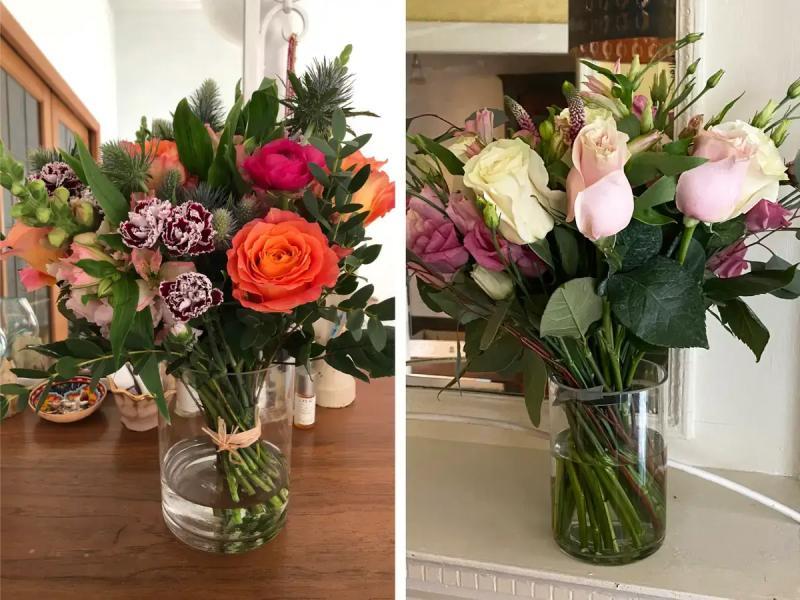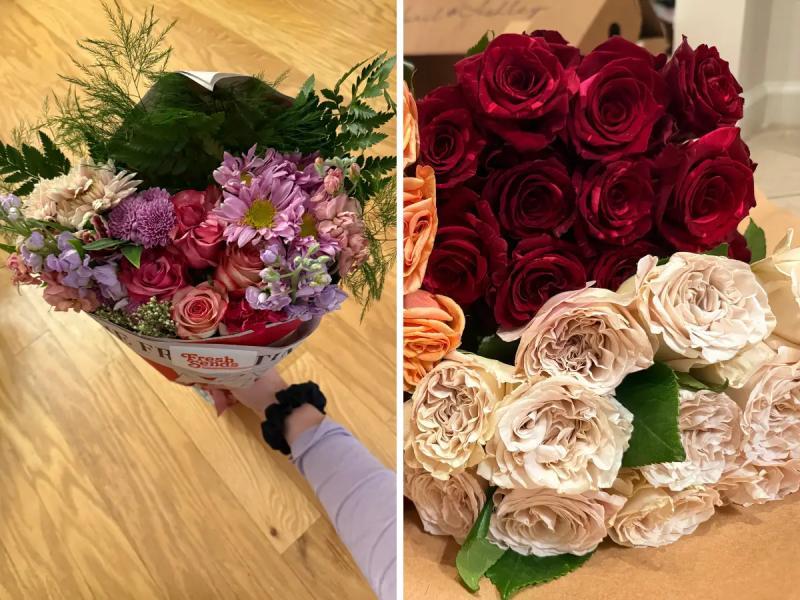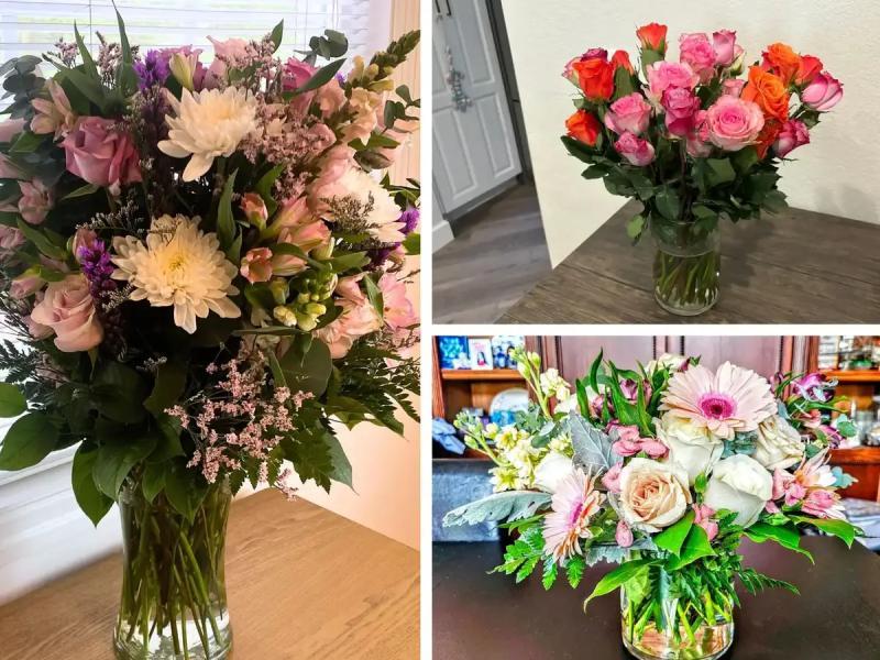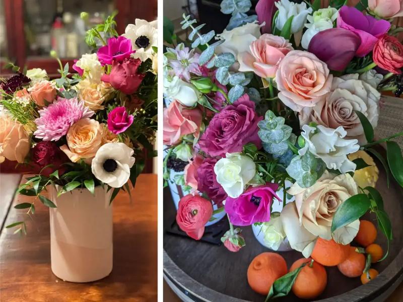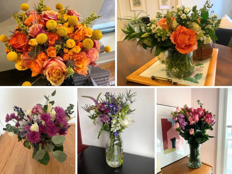 我们在佐治亚、密歇根和加州自寄四束花,均色彩鲜艳,超出照片效果。当地配送花束无需修剪即可展示。FedEx配送的全玫瑰花束寿命最长,其他本地配送花束约一周开始凋谢。唯一例外是从厄瓜多尔空运的毛茛花,因低温冻结未能恢复。