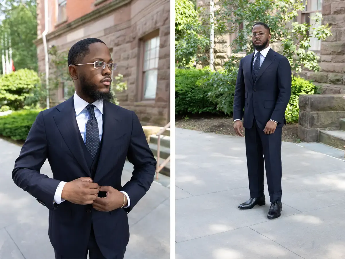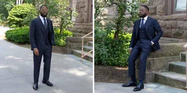 最终试穿时,我们决定裤脚稍微短一点,店员当天就开始修改。调整完成后,西装完美贴合,穿着舒适,行动自如,深蓝色也非常精神。