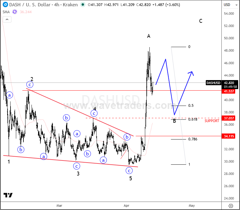 据相关技术观点,Dash价格在形态完成后出现一轮明显上冲,被解读为艾略特波浪理论中的波浪A。这一阶段的快速反弹被认为反映出买盘兴趣回升,为后续进一步走高奠定基础。