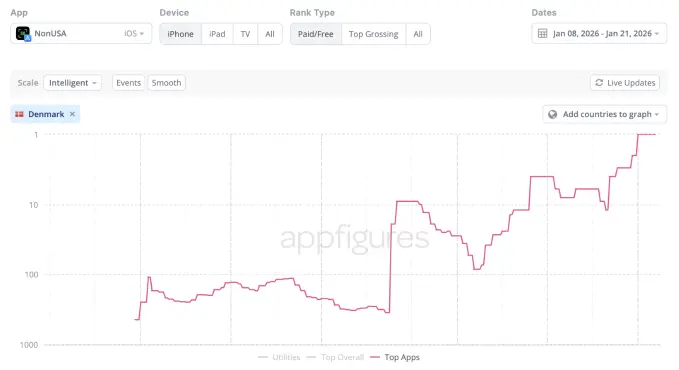 Appfigures 的数据还显示,NonUSA 当前的前五大市场包括丹麦、挪威、瑞典和冰岛,反映出这一应用在北欧多国获得用户关注。