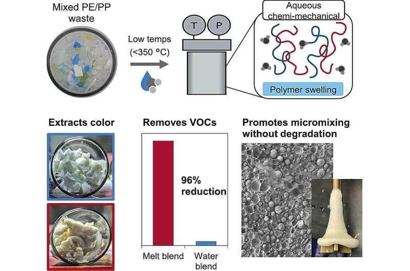 研究团队与初创公司Seauciel合作,评估该公司提出的第三种路径——“水热化学机械回收”。该方法利用高于常压沸点加热水的特性,使塑料中的聚合物转变为可在微观尺度相互混合的状态。测试结果显示,经化学机械处理后,聚合物实现了微观混合。