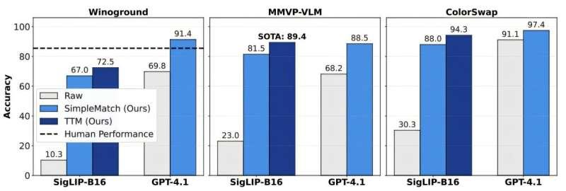 在其中一项名为 MMVP-VLM 的基准测试中,TTM 将 SigLIP-B16 的表现提升到 89.4%,成绩超过了 GPT-4.1。