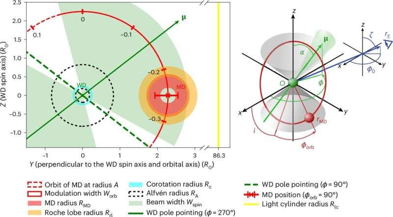 在机制解释上,论文参考此前对白矮星脉冲星的研究思路,将GPM J1839-10建模为:白矮星的磁极在扫过伴星的恒星风时产生射电束;双星在轨道运动中观测视角的变化可再现其“心跳式”的脉冲节奏。研究人员表示,模型还可用于重建系统几何结构参数,包括恒星间距与质量等。
