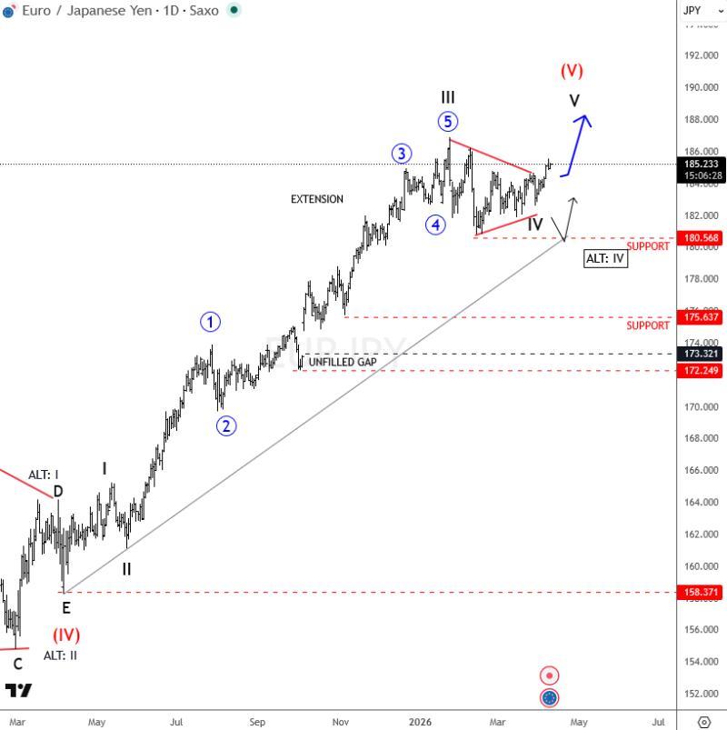 近期汇价出现一定放缓和盘整。分析认为,这一阶段或仍属于上升趋势中的调整过程,理想情形下可被视作标注为“黑色第四浪”的整理。目前,181至180区间被视为关键支撑区域,价格在该区间附近的表现,被认为可能正在构筑一个看涨三角形形态,从而为后续第五浪的上行延续保留空间。