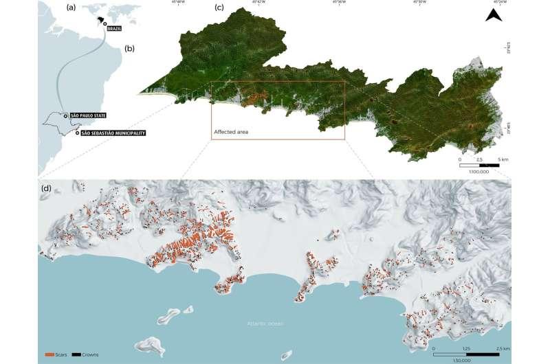 研究背景指向2023年2月发生在巴西圣保罗州北海岸圣塞巴斯蒂昂市的极端降雨事件:不到15小时内降雨量达到683毫米,而当地月平均降雨量为300毫米。该次灾害造成65人死亡,数百人无家可归。