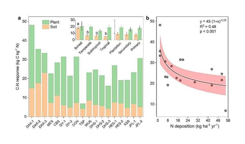 在碳汇效应方面,研究采用化学计量学放大方法量化氮沉降对森林碳汇的贡献,测得碳氮响应范围为每公斤沉降氮对应7至40公斤碳,其中北方针叶林和年轻人工林的响应更强。国家尺度估算显示,氮沉降每年可增强中国森林碳汇约0.11亿吨碳,约占中国森林碳汇总量的20%至30%。