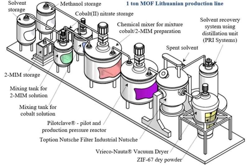 在此背景下,尤塞夫基于实验室合成流程,设计了一条面向工业规模的MOFs集成生产线方案,并选用市售工业设备,对各生产阶段、环节集成方式及整体产能进行评估。