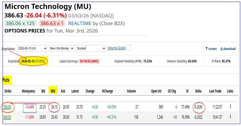 例如,一份执行价为330美元、到期日为2026年5月15日的美光看跌期权,其期权中间价约为26.10美元。该执行价较383.43美元现价折价约14.7%。