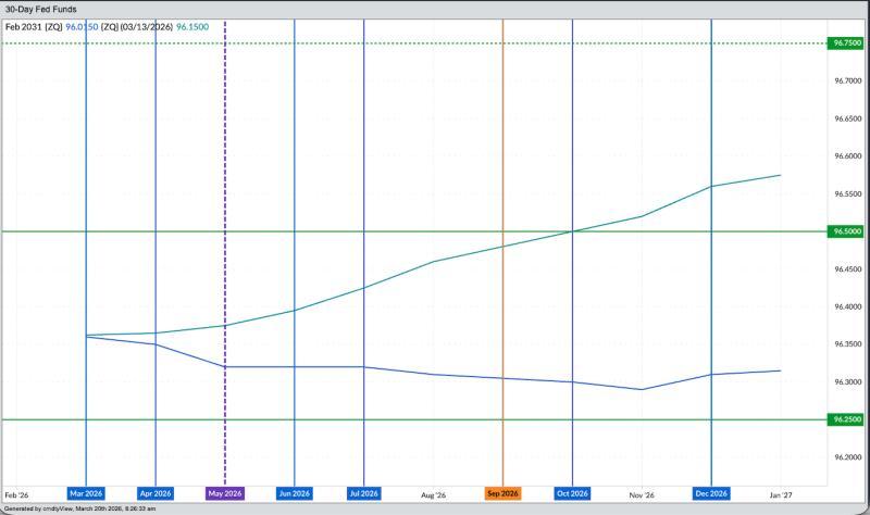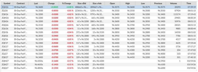 此前在周三的盘前评论中,相关分析曾对联邦基金期货(合约代码 ZQK26)的远期曲线进行过描述,并与3月13日(周五)的曲线进行比较。当时的曲线形态与上周三大致相似。