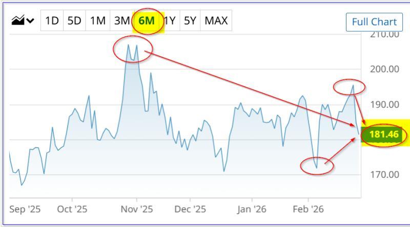 在股价表现方面,截至2月27日周五中午交易时段,NVDA报181.67美元,低于2月25日财报发布前的195.56美元,但高于2月5日的近期低点171.88美元。过去六个月内,该股最高价出现在2025年11月3日,为206.88美元。