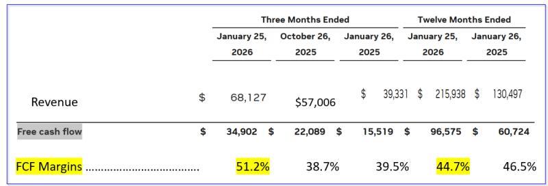 英伟达公司(Nvidia, Inc.,纳斯达克代码:NVDA)最新财报显示,公司自由现金流在最近一个财季和整个财年均实现大幅增长,自由现金流利润率显著提升。