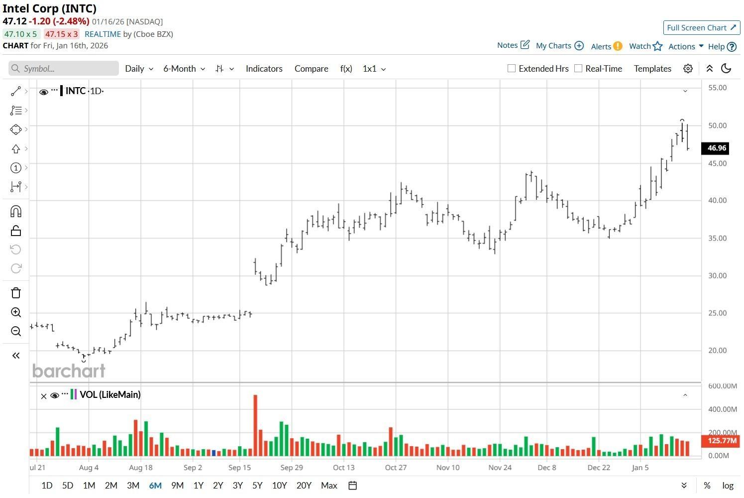 从更短周期看,基于隐含波动率的测算,至下周末英特尔股价的预期波动幅度约为7.73%。按此推算,股价最早可能在1月23日附近触及或突破50美元水平。