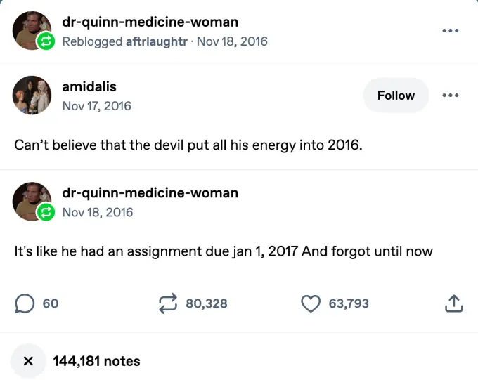 这类内容提醒人们,2016年在当时并不被视为“美好”。那一年发生了英国脱欧公投、叙利亚内战进入高潮、寨卡病毒暴发以及Pulse夜店枪击案等一系列重大事件。除了唐纳德·特朗普在美国总统选举中的高度争议性胜出之外,早在选举前几个月,就有专栏作者在《Slate》上严肃提出问题:2016年与历史上一些“最糟糕的年份”相比如何,例如1348年黑死病肆虐之年,或1943年大屠杀高峰期。