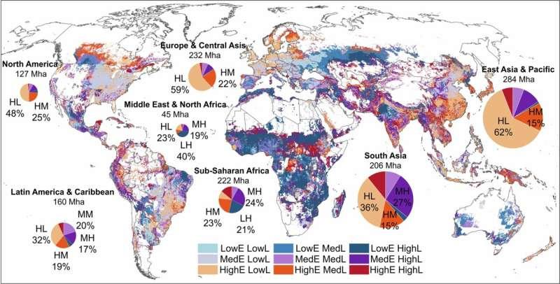 在方法上,新地图融合历史数据与模型结果、地面与遥感观测、清单调查以及水文信息等。基于该综合数据集,研究人员估算2020年全球农田排放约为25亿吨二氧化碳当量。其中,东亚及太平洋地区贡献约一半;南亚、欧洲和中亚合计贡献30%。