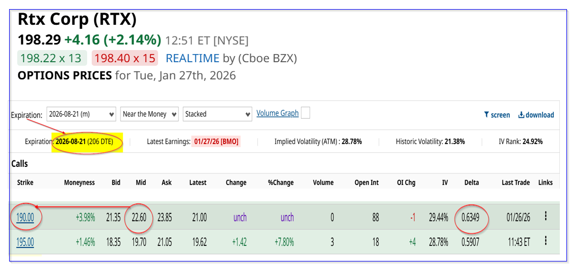 在假设情形下,若RTX股价在2026年8月21日前后升至235美元,则该期权的内在价值为45.00美元(235.00美元 − 190.00美元)。扣除22.60美元期权成本,单份期权利润为22.40美元,9份合约合计利润约为20160美元,对应投入20340美元,名义回报率约为99%。