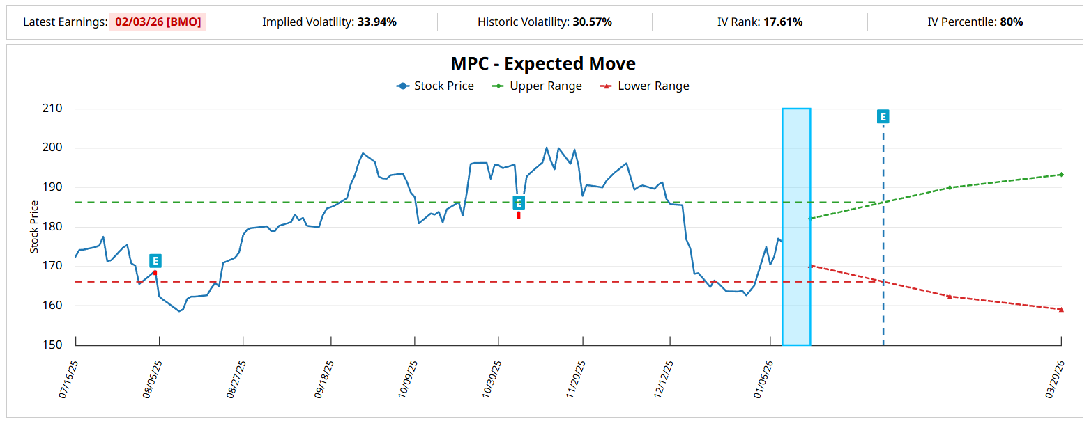 根据基于布莱克-斯科尔斯模型的预期波动计算,MPC股票在2026年2月20日到期时的理论价格区间约为162.38美元至189.96美元。该区间被用来解释为何部分机构看涨交易集中在180至185美元行权价附近。