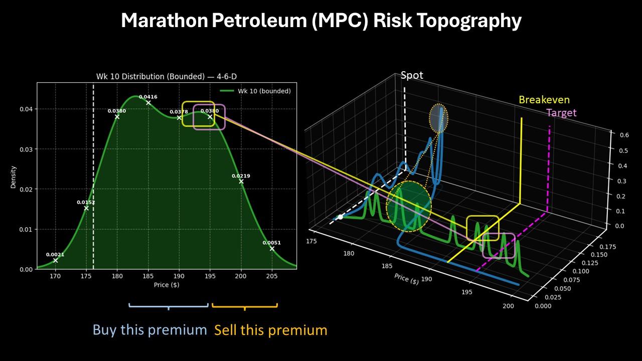 在这一框架下,相关测算显示,未来10周内MPC股价终结于180美元至195美元区间的概率密度相对均衡,且在该区间内的概率衰减较为缓慢。有观点据此认为,在当前地缘政治扰动加剧的背景下,市场对该区间的定价可能偏于保守。
